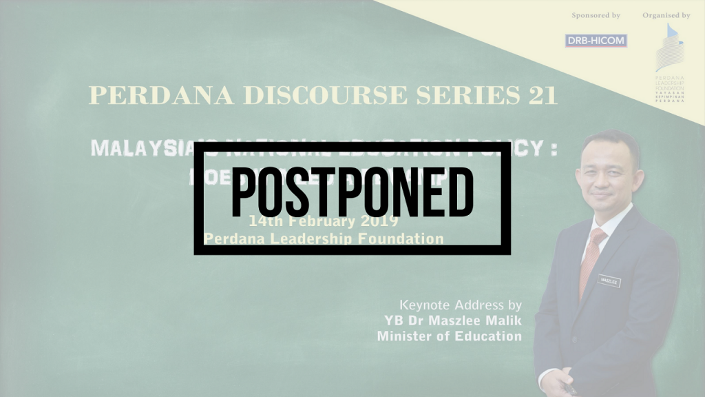 The Perdana Leadership Foundation invites you to our Perdana Discourse Series 21 entitled “Malaysia’s National Education Policy: Does It Need a Revamp?”, with a keynote address by YB Dr Maszlee Malik, Minister of Education, Malaysia followed by a panel session. Date: 14th February 2019Time: 2.00pm – 6.00pmVenue: Perdana Leadership Foundation, Putrajaya Schedule* 2.00pm: Registration & …