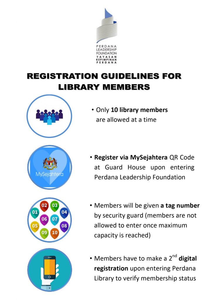 We are open to our members (membership to Perdana Library is free and can be done online or in-person) from 1st September 2020 at the new opening hours of 8.30am – 5.00pm. For health and safety reasons, we implement the following Standard Operating Procedures: