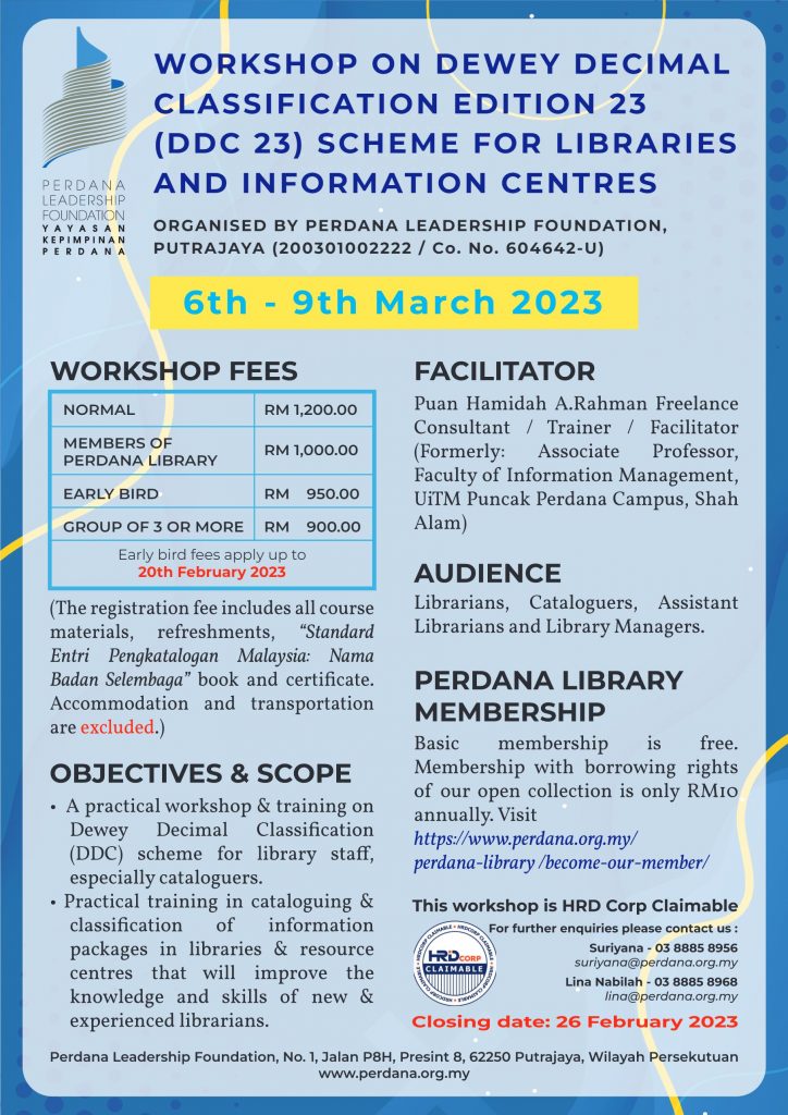 Perdana Leadership Foundation invites you to join our Workshop on Dewey Decimal Classification Edition 23 (DDC 23) Scheme for Libraries and Information Centres.