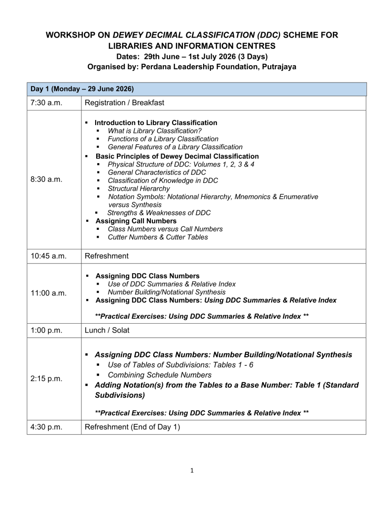 Perdana Leadership Foundation invites you to join our second cataloguing workshop of 2026; the Workshop on Dewey Decimal Classification (Edition 2024) Scheme for Libraries and Information Centers.